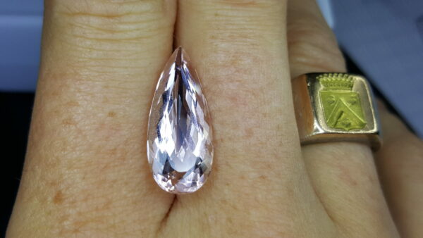 Somptueuse et féminine Morganite pêche, cette poire modifiée et d’une couleur pêche chaire, un pêche doré et rosé à la fois.